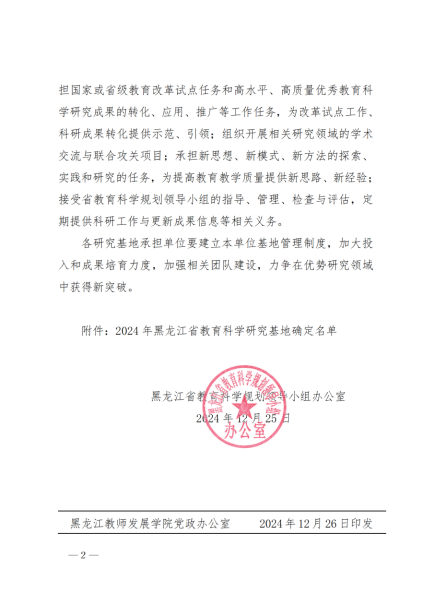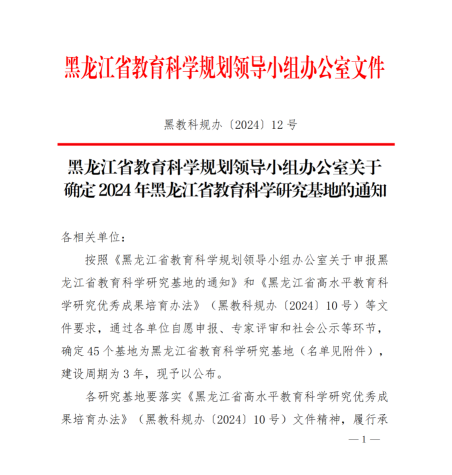 近日,根据黑龙江省教育科学规划领导小组办公室印发《关于确定2024年黑龙江省教育科学研究基地的通知》(黑教科规办〔2024〕12号),pg游戏官网院长由婧涵教授牵头申报的《大学生价值观教育研究基地》成功获批。黑龙江省教育科学研究基地是由省教育科学规划领导小组办公室组织遴选,旨在贯彻《黑龙江省高水平教育科学研究优秀成果培育办法》(黑教科规办〔2024〕10号)文件精神,致力于挖掘和培育优秀教育科研成果,提炼、总结并推广我省教育科研领域的优秀成果,以期在高质量教育科学研究优秀成果评奖中取得突破,全面提升我省教育科学研究成果的质量,推动龙江教育的优质发展。