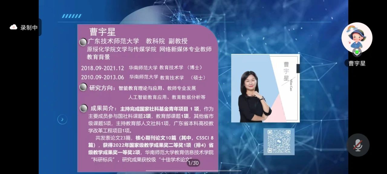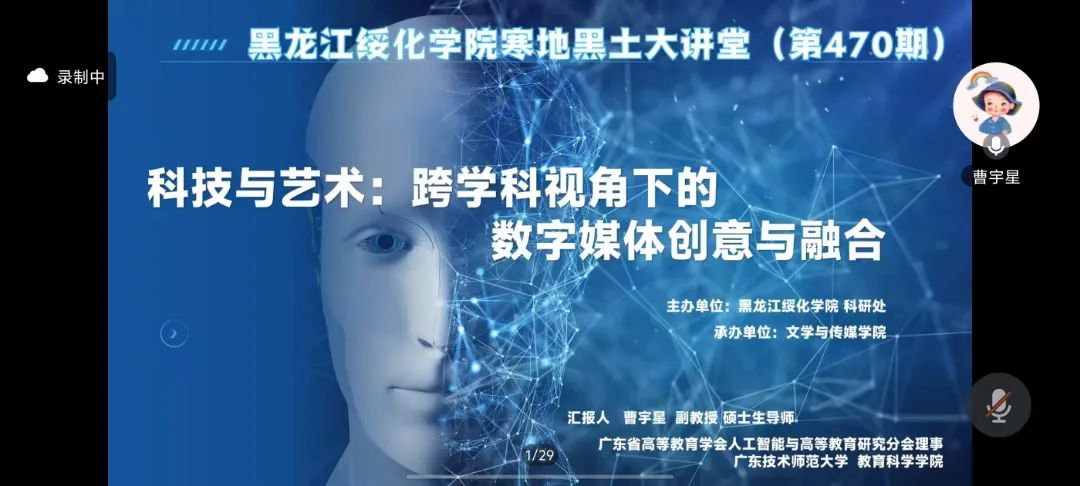 12月8日晚19:00,由科研处主办、pg游戏电子模拟器承办的第470期寒地黑土大讲堂在腾讯会议平台如期举行。pg游戏官网特邀广东技术师范大学教育科学学院副教授、硕士生导师、华南师范大学硕士专业学位研究生校外导师、广东省高等教育学会人工智能与高等教育研究分会理事曹宇星教授为文学院师生作了题目为《科技与艺术:跨学科视角下的数字媒体创意与融合》的学术讲座。讲座由网络与新媒体专业负责人陈威主持,吸引了学院250名左右学生积极参与。