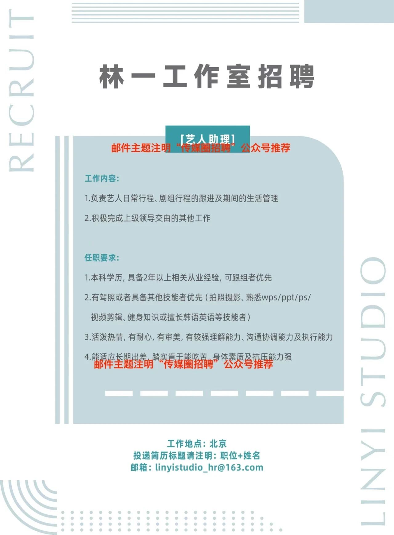 就业指导丨林一工作室招聘艺人助理!