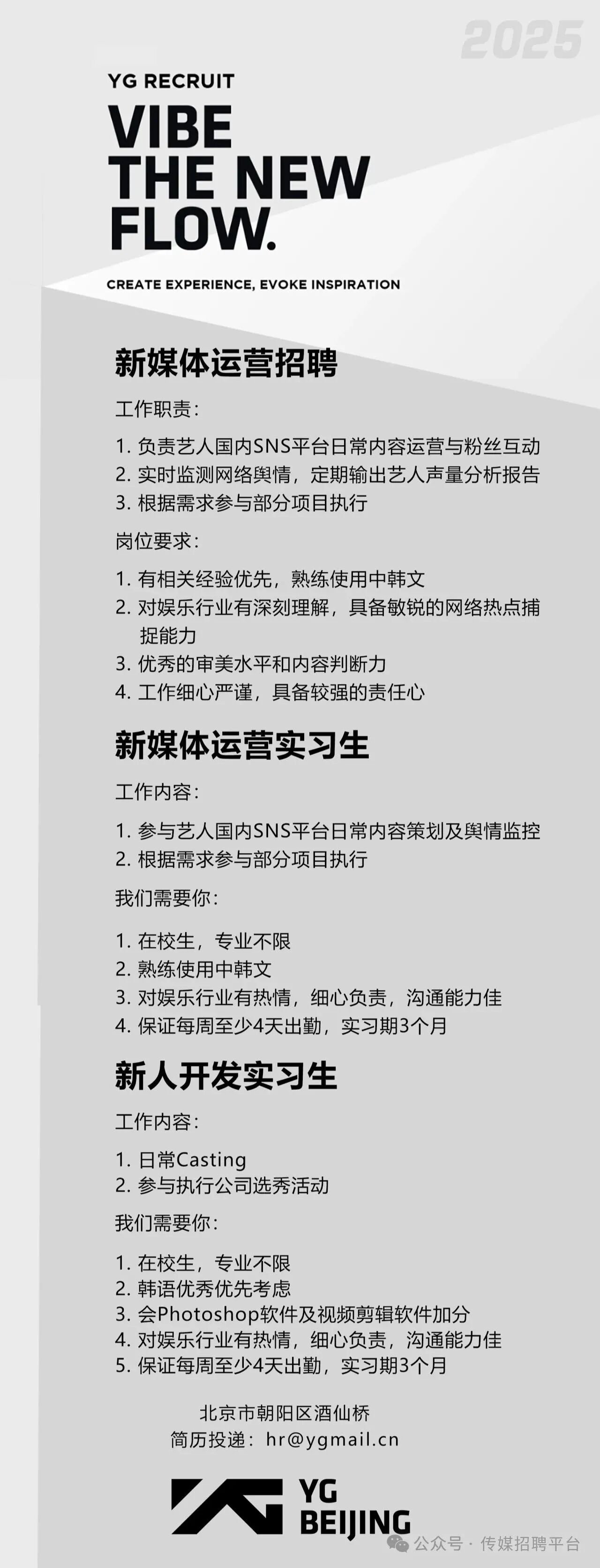 就业指导丨YG娱乐招聘新媒体运营、新媒体运营实习生、新人开发实习生