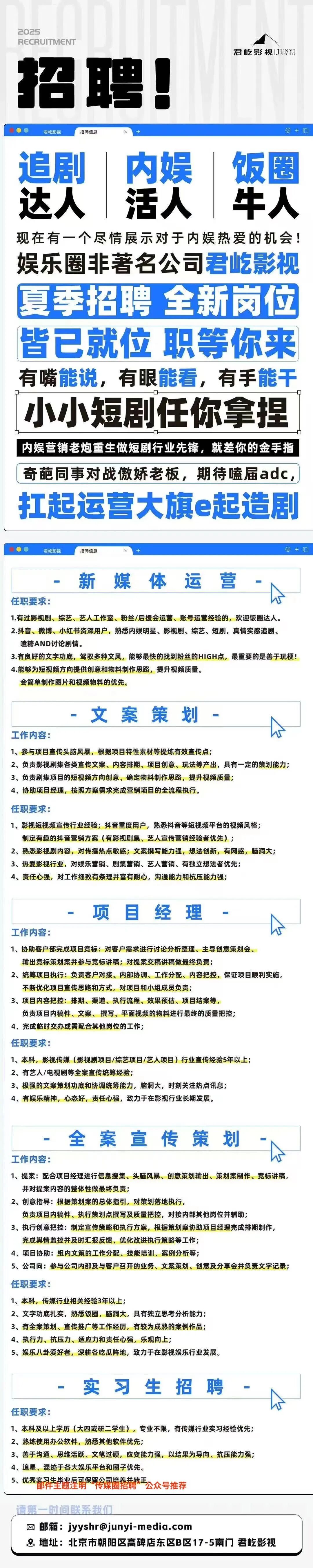 就业指导丨君屹影视招聘公告(5大岗位 含实习)