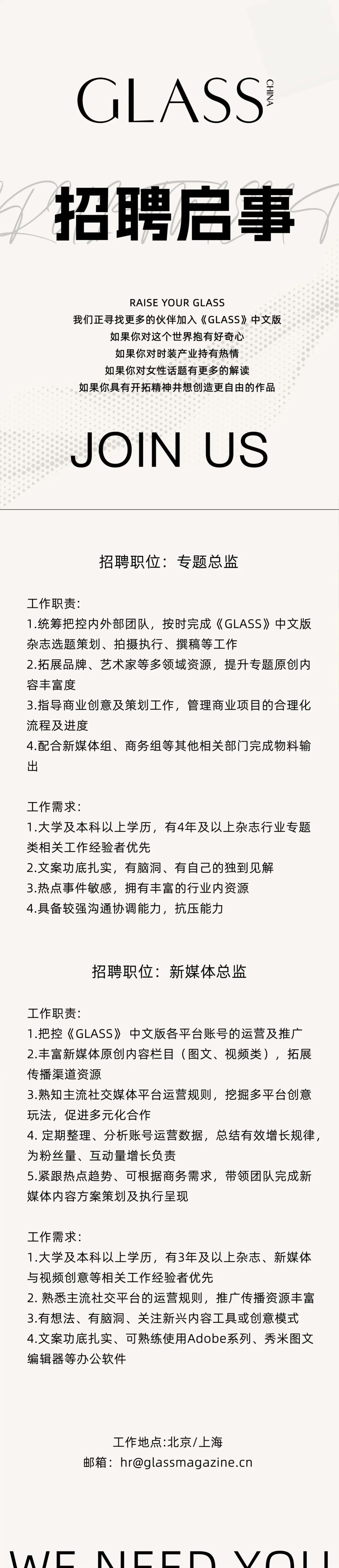 就业指导丨《GLASS》中文版招聘专题总监、新媒体总监(北京/上海)
