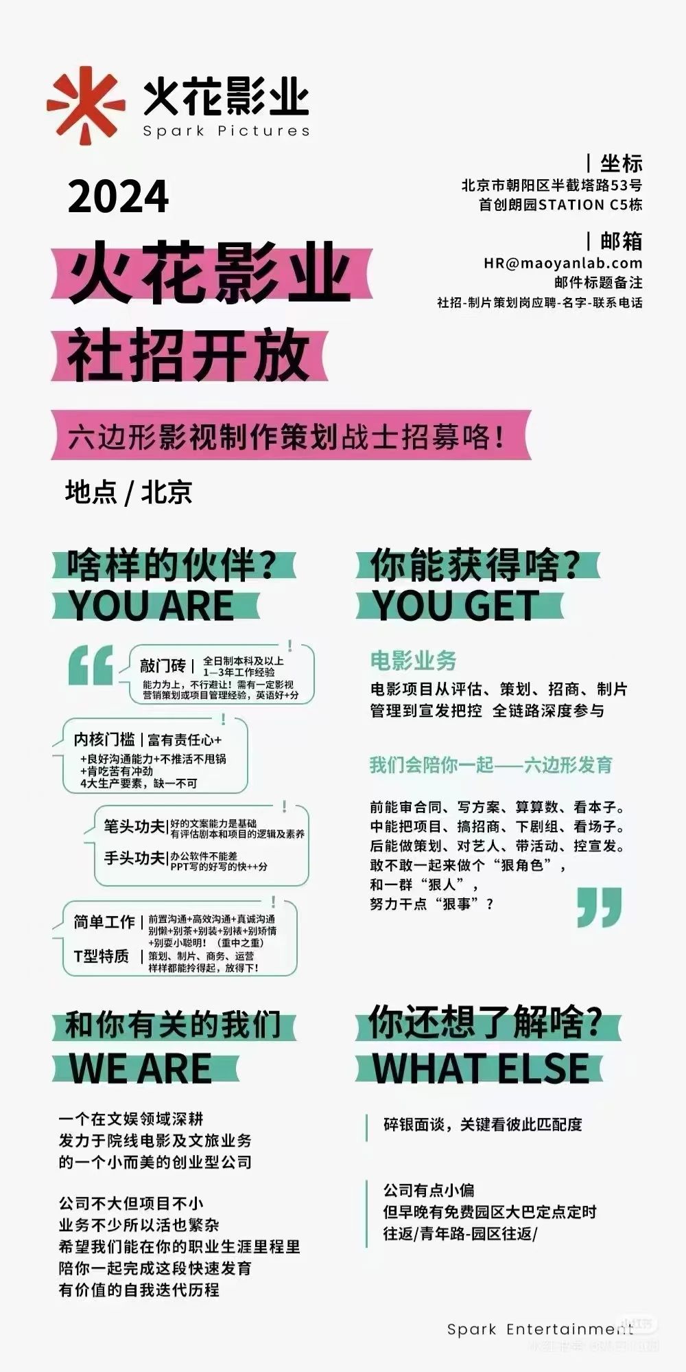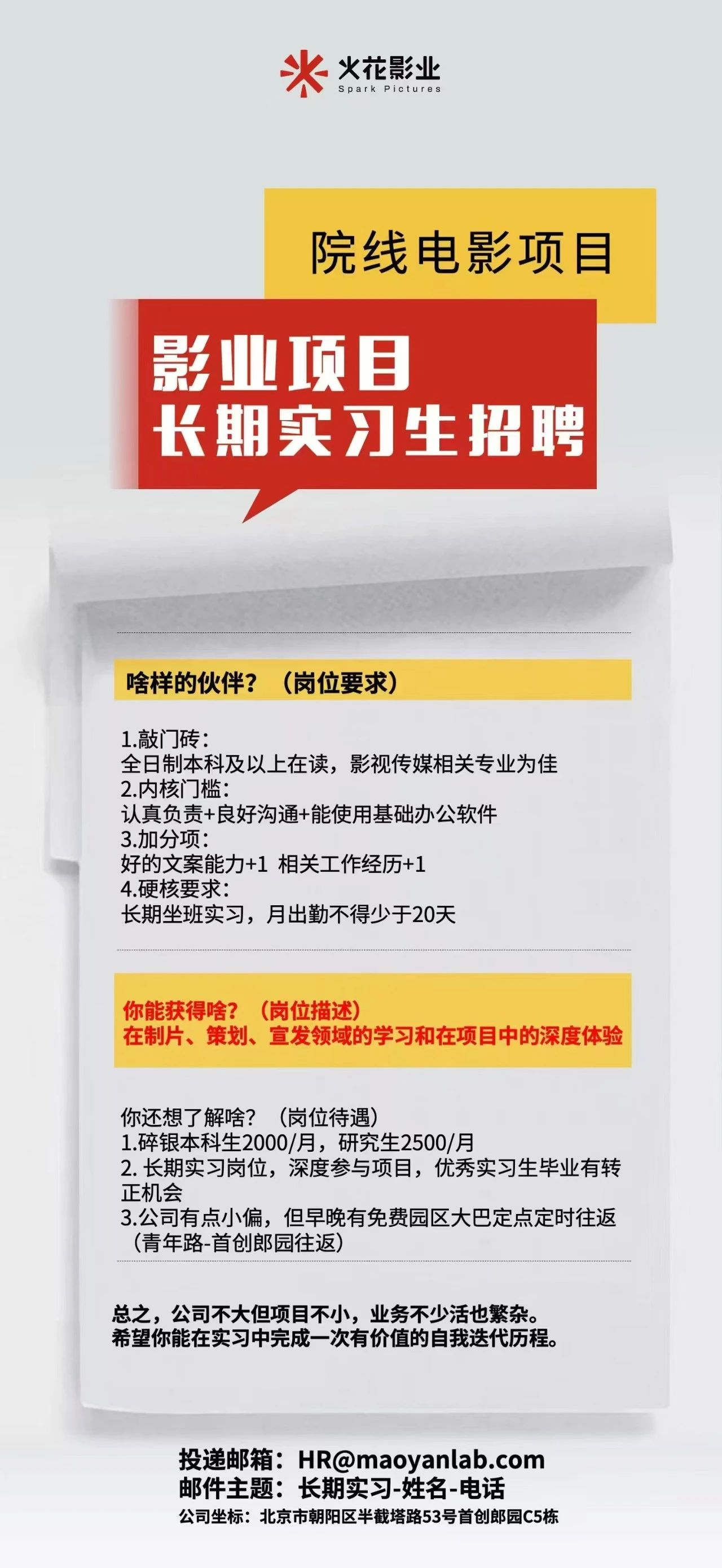 就业指导丨火花影业招聘影视制作策划、影业项目实习生