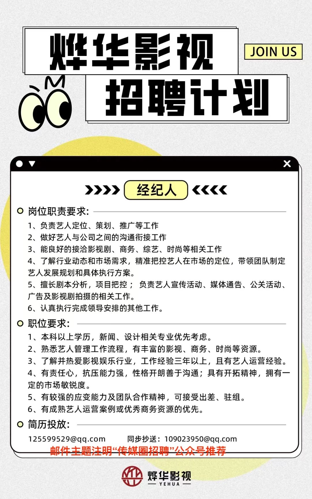 就业指导丨烨华影视招经纪人!