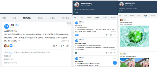 开学初,为了帮助大家适应教学圈,王璨老师提前在圈子里发布自我介绍还配了照片,由于对新任课教师的好奇,同学们纷纷在圈子里留言,表示期待新学期网课。未曾谋面的师生,就这样提前在圈子里熟络起来。