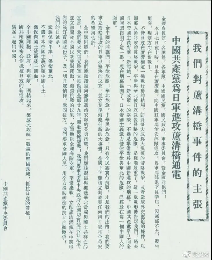 1937年7月8日,中共中央向全国发出《中国共产党为日军进攻卢沟桥通电》,号召全国同胞奋起抗战。