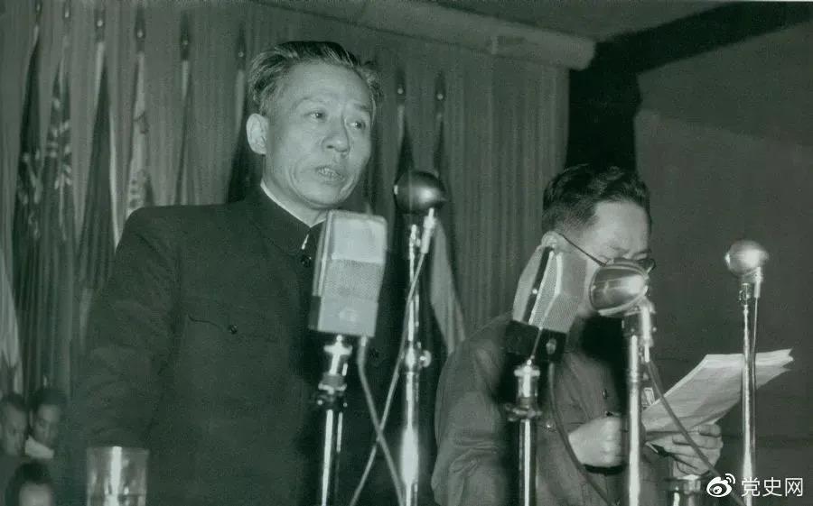 1949年11月16日,刘少奇在亚洲澳洲工会代表会议开幕式上讲话。