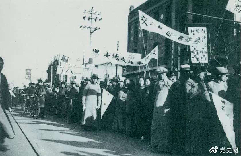 1935年12月9日,中国共产党领导北平学生掀起声势浩大的抗日救亡运动,并迅速波及全国,形成抗日救国的新高潮。图为游行队伍。