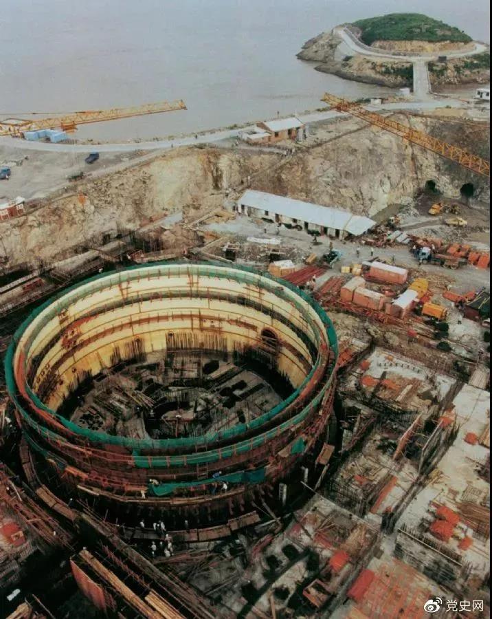 1991年12月15日,中国第一座自行设计、自行建造的核电站——秦山核电站并网发电。图为建设中的秦山核电站。