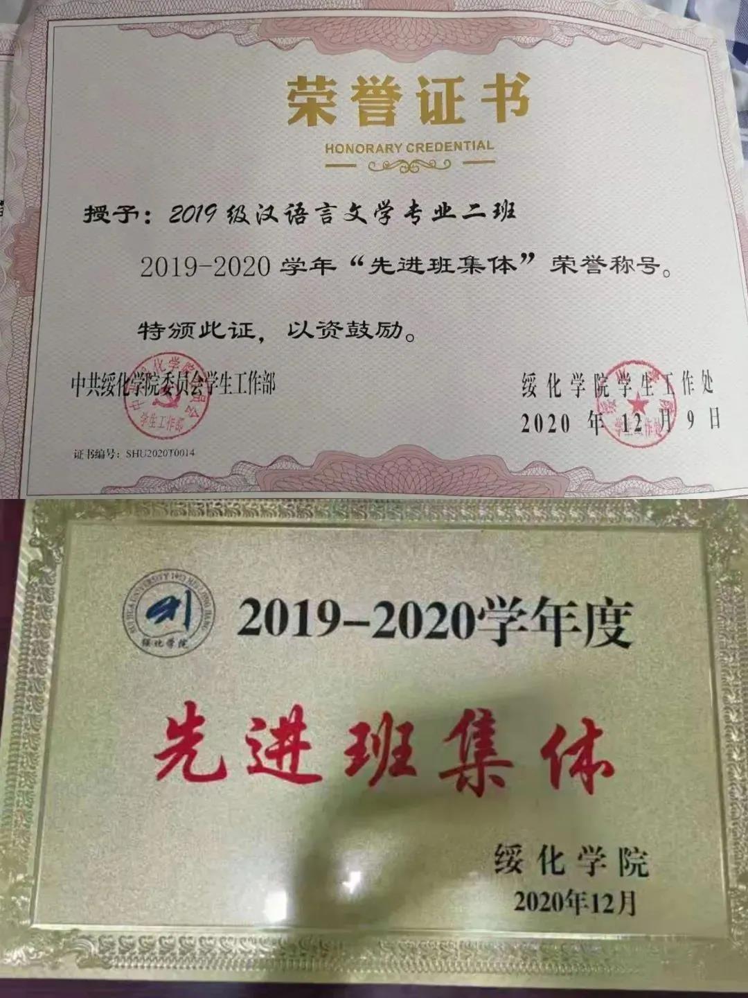 班级成立两年多以来,形成了积极向上、团结奋进、锐意进取、朝气蓬勃、温暖和谐的学风。在辅导员的关怀和班委的领导下,全班同学在思想、学习、活动等方面都取得了显著的成绩,充分体现了班集体自强不息、积极向上的团队精神和强大的凝聚力,我们班在各方面都交出了令人满意的答卷。在2019-2020学年,班级获得“先进班集体”荣誉称号。