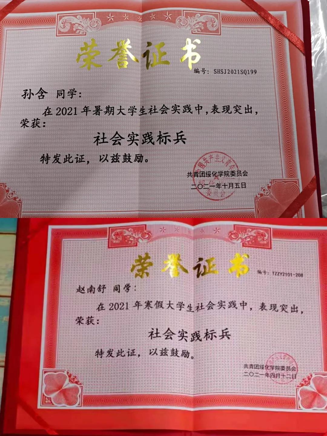 同时,我们重视素质培养,课外活动、社会实践相结合,形成了团结一致、互帮互助的优良班风和高素质、高效率的优秀班委会。赵南舒、孙含等同学在假期里积极参与社区内防疫工作与校里组织安排的敬老院看望老人等系列活动,获得2020-2021学年“社会实践标兵”荣誉称号。陈红同学积极参加校内大学生心理服务活动,获得2020-2021学年“三好学生”荣誉称号。