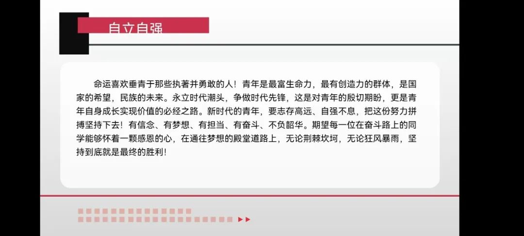 2021级数字出版一班徐瑞琪说道:“通过本次召开线上“励志、感恩、诚信”主题教育班会,让我明白了要志存高远、自强不息,努力拼搏。期望每一位在奋斗路上的同学能够怀着一颗感恩的心,在通往梦想的殿堂道路上,无论荆棘坎坷,无论狂风暴雨,坚持到底就是最终的胜利!”