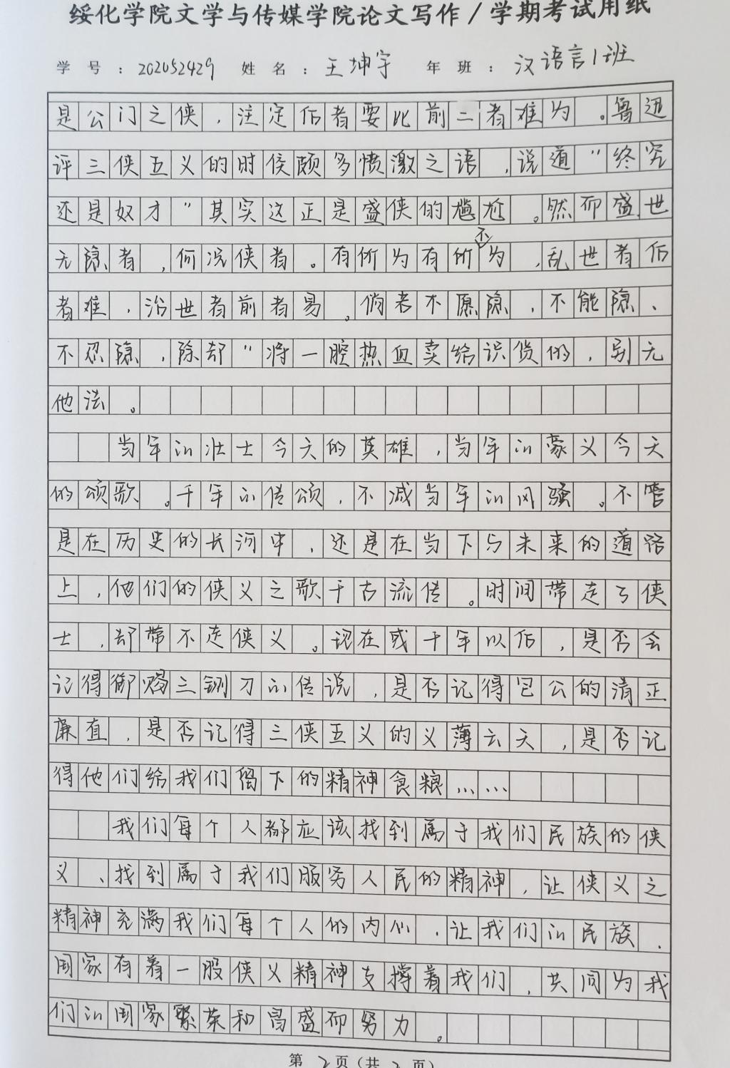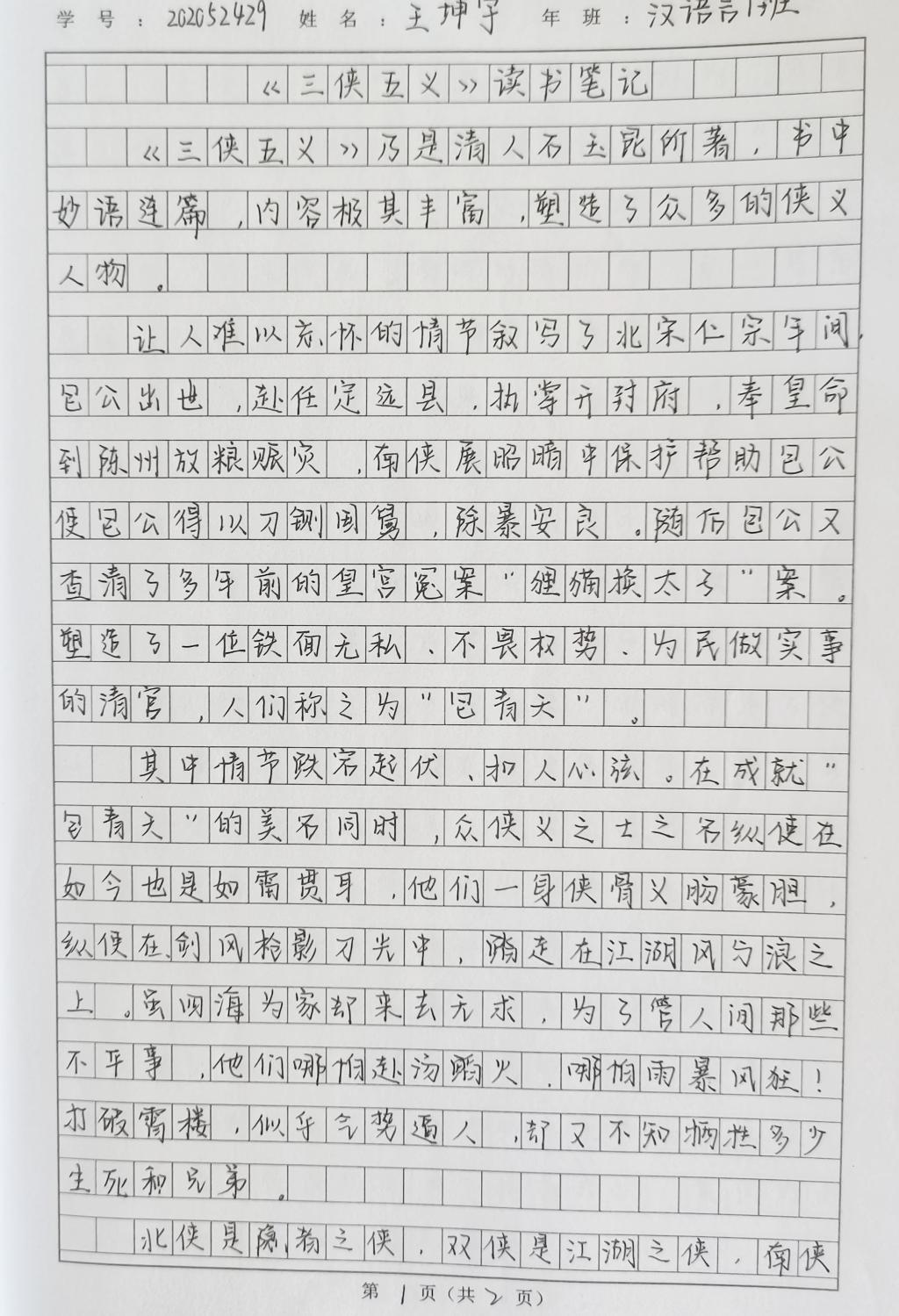 2020级汉语言文学一班王坤宇