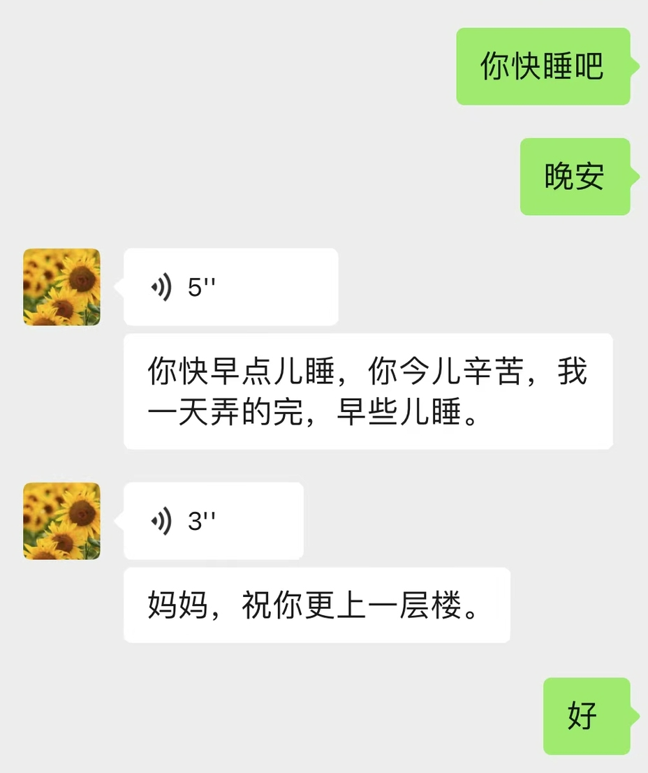 无论我分享给妈妈什么样的废话,她都能很认真的回复我。写完一篇文章,好好地吃了一顿饭,上了一整天的课,她也觉得我是很棒的孩子,把我当作她的骄傲。非常谢谢她对我的鼓励,让我有了面对很多困难的勇气。