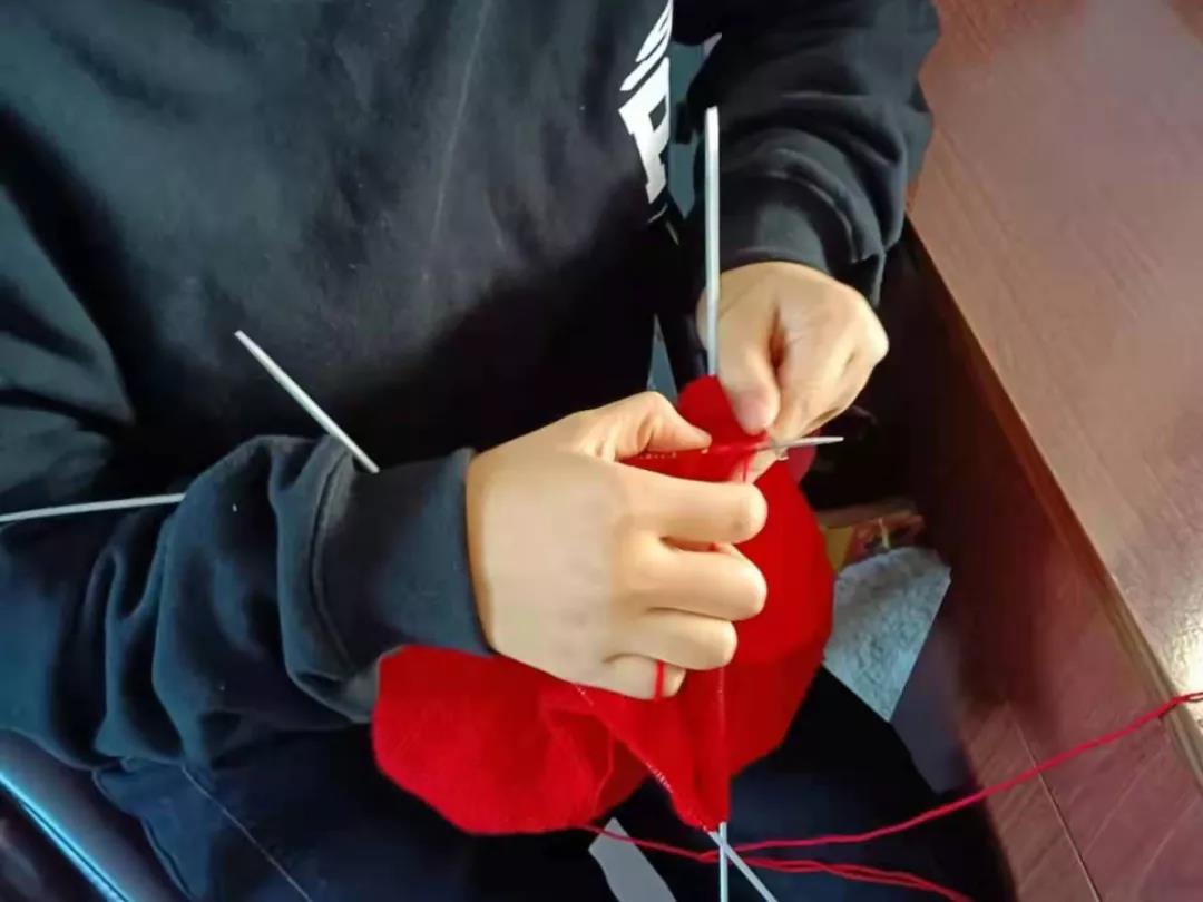 毛线刚拿到手,我就在想应该如何编织,内心很憧憬。在我正式开始织毛衣前,先去找大娘给毛衣起针。回到家我看着妈妈的两只手动的好快,看着特别复杂,我让她一遍又一遍地教我,把右面的针架在胳膊上,右手小拇指缠上两圈线控制松紧,右手大拇指和食指把住,两只手配合,一针一线,一圈一圈,整个过程我学了一下午才熟练。一开始会觉得太复杂了,到最后掌握整个过程,都是对自己的一种磨练。在要放弃时想到这些毛衣是要给贫困山区的留守儿童的,这点小困难就不值一提了。尽管过程曲折漫长但想到能给他们带去温暖,就感觉没有那么累了,并且更加坚定了我帮助别人的心。