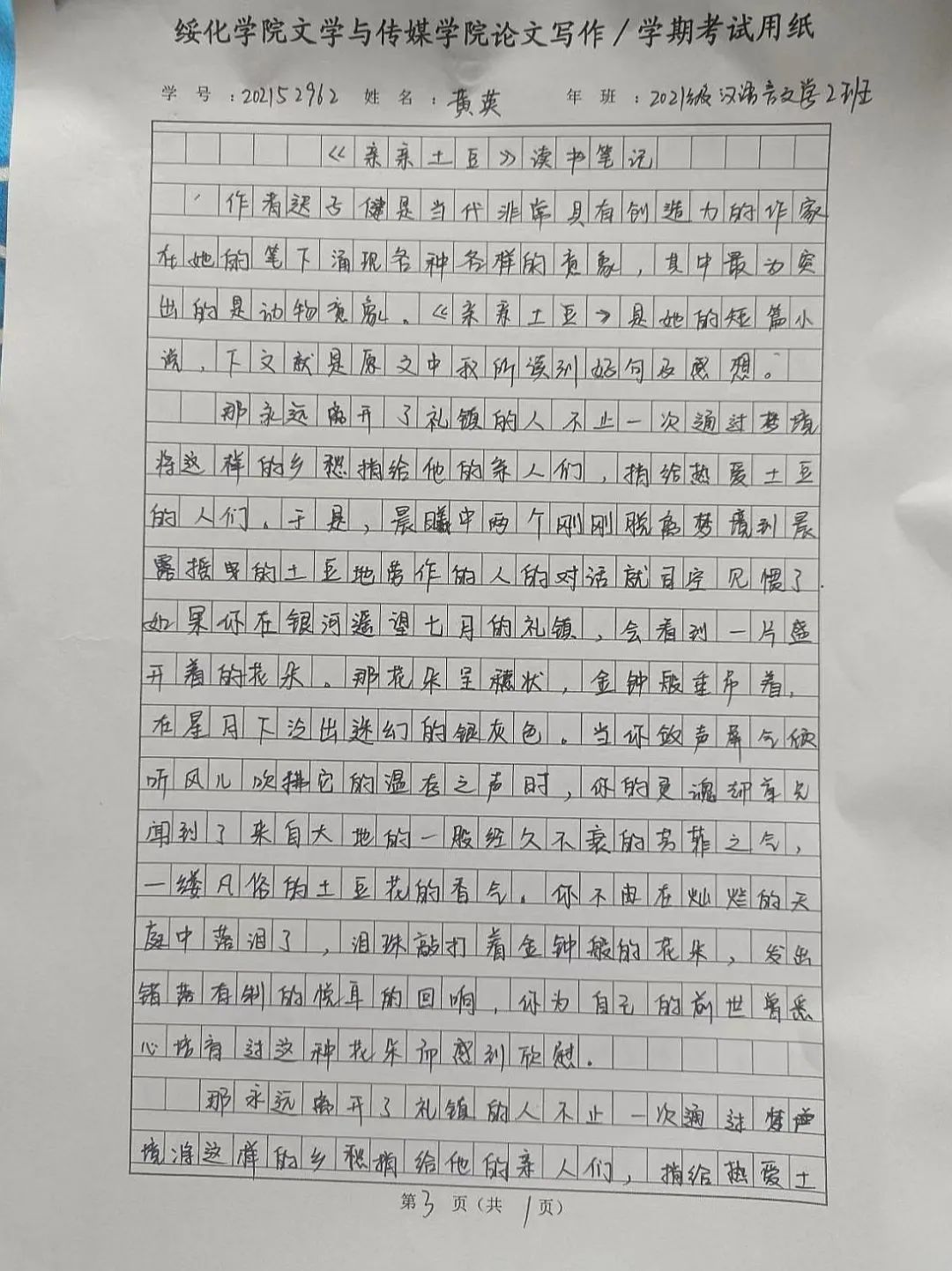 2021级汉语言文学二班黄英