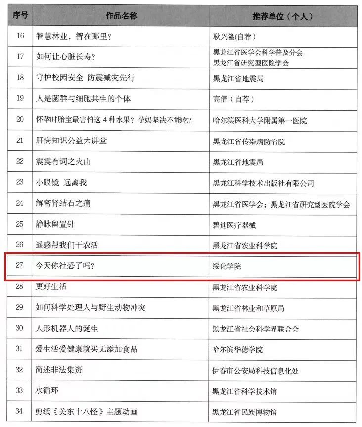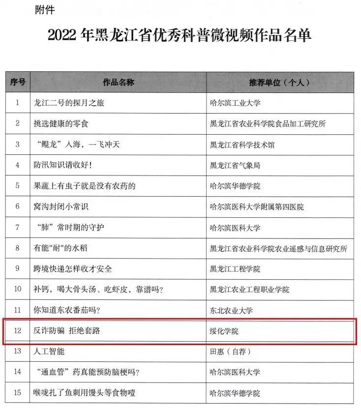 近日,黑龙江省科学技术厅发布《关于公布2022年黑龙江省优秀科普微视频作品名单的通知》,由pg游戏电子模拟器王乐老师指导的2项作品《反诈防骗 拒绝套路》、《今天你社恐了吗?》荣获优秀科普微视频奖,创作者分别为网络与新媒体专业的学生吴妍与冯高鑫。